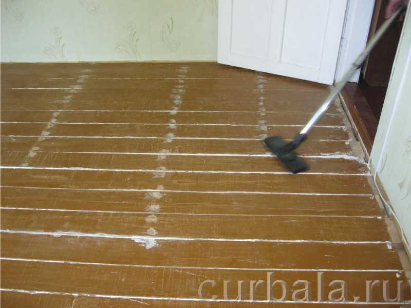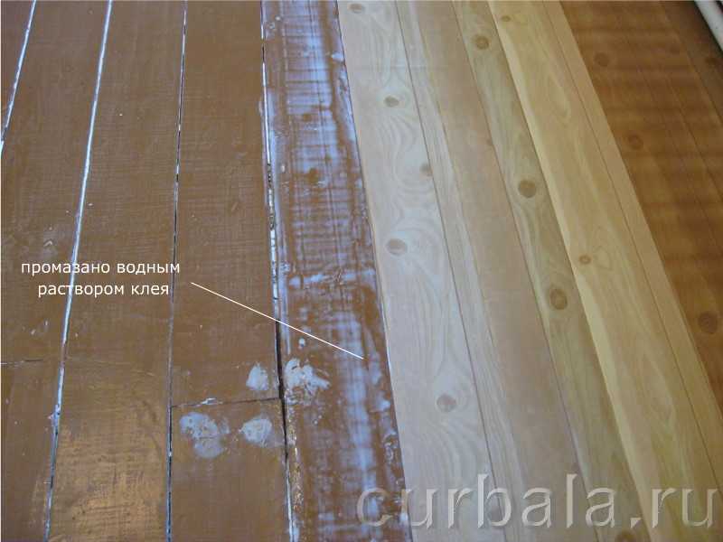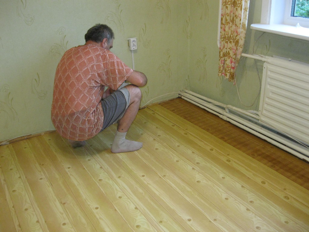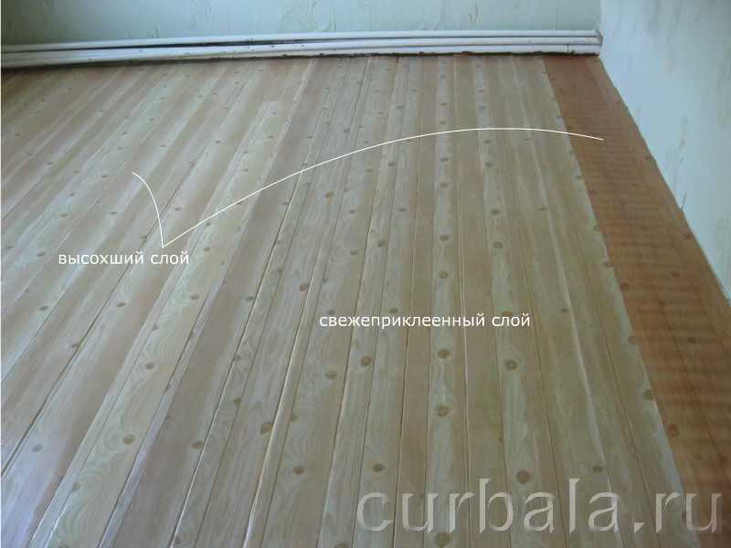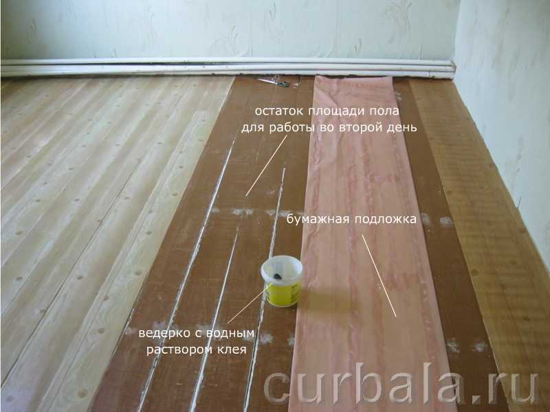 Оклеенную поверхность дощатого пола нужно оставить для сушки не менее чем на сутки. На третий день просохшую текстурную бумагу покрываем паркетным