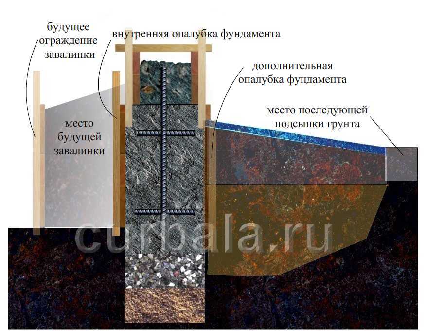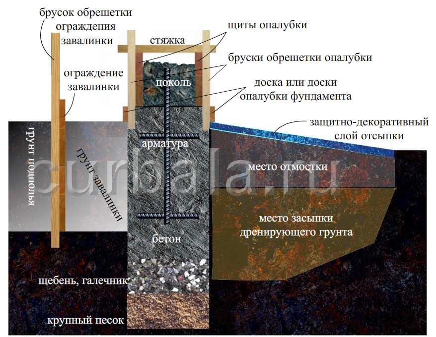 Если планируется возведение бетонного цоколя, то к брускам обрешетки снаружи крепятся доски опалубки фундамента, а затем устанавливается внутренняя съемная опалубка (рисунок 8). При возведении цоколя из других материалов высота опалубки ограничивается высотой надземной части фундамента. Между фундаментом и цоколем обязательна прокладка гидроизоляционного материала.