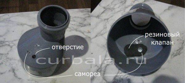 Клапан сброса разрежения - это резиновая пластина овальной формы, которая изнутри прикреплена к трубе саморезом. Пластина должна закрывать просверленное отверстие в конечной части корпуса трубы. Клапан работает очень надежно несмотря на простоту его устройства.