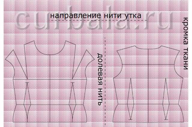 При переносе контура выкройки на ткань необходимо учитывать расположение лекал согласно направления долевой нити ткани (рисунок 1). При размещении деталей выкройки на ткани обязательно нужно оставлять по краям каждой детали запасы на швы не менее, чем: