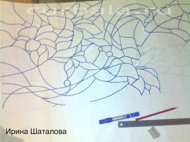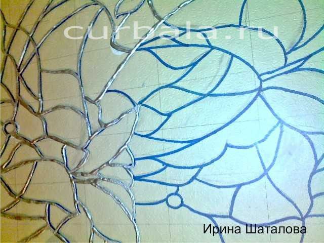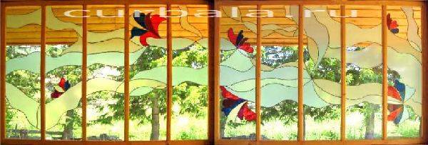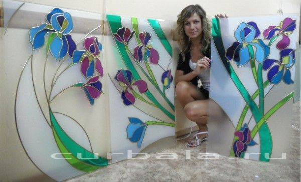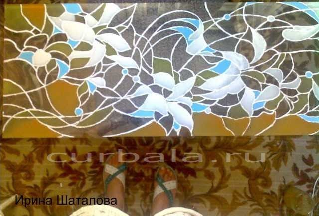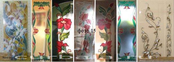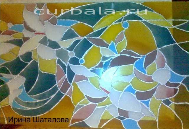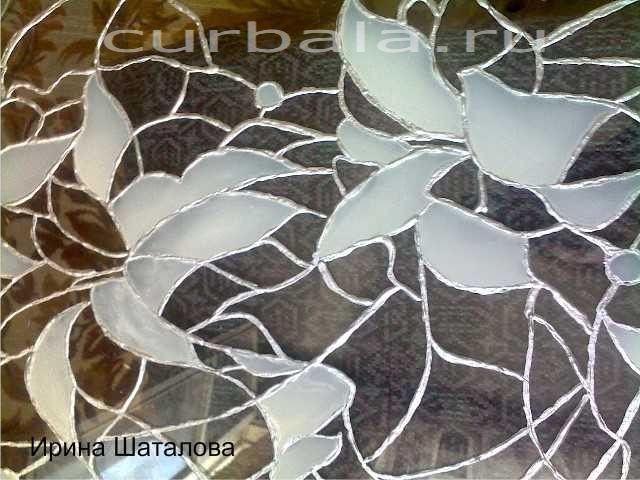 Витражу можно придать различную степень прозрачности (фото 15). Для создания матовости, полупрозрачности витража следует задувать поверхность лаком с большим (ударение на О) количеством воздуха. Либо наклеить пленку для стекла с различной степенью прозрачности.