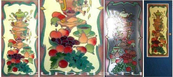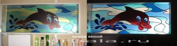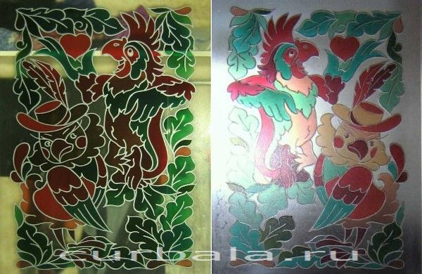 На готовый витраж вместо покрытия лаком можно наклеить самоклеющуюся декоративную пленку со стороны рисунка, имитирующую рифленое стекло. Это уменьшит его прозрачность, придаст оригинальности изображению.Заменить рисунок витража через несколько лет Вы сможете не меняя стекла, смыв его растворителем или сняв окраску скребком (хотя это не просто).