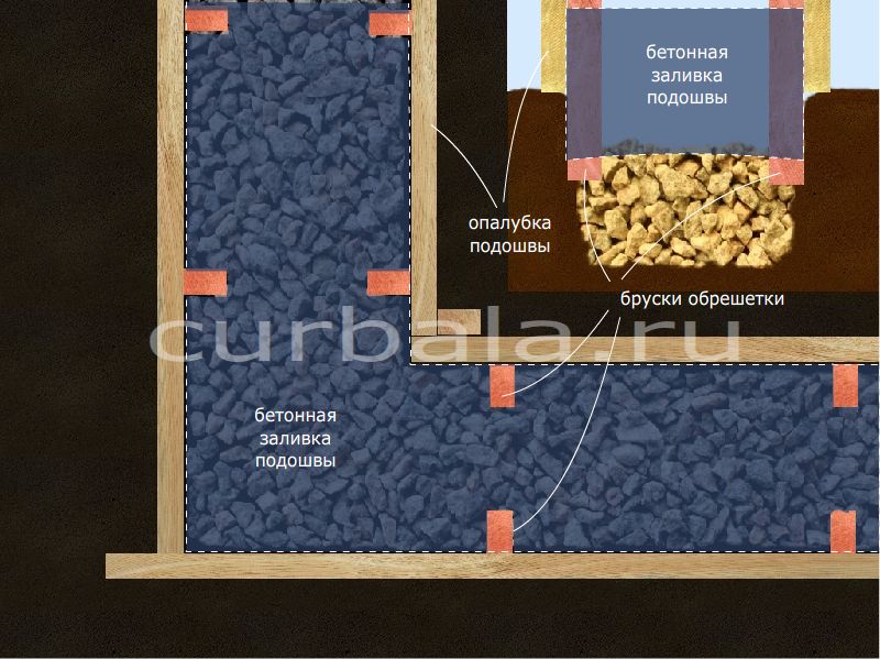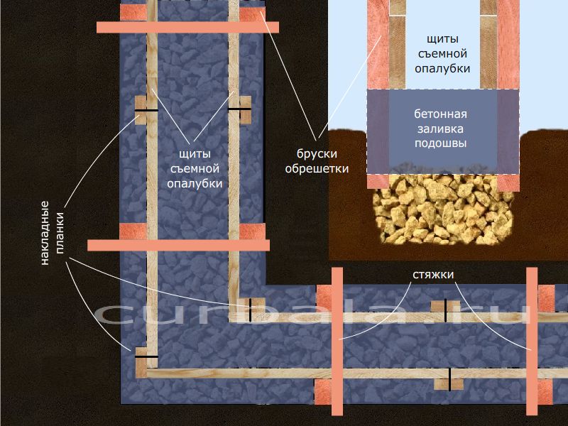 Форму опалубки, в процессе заливки, нужно наполнять бутовым камнем (камень с колотыми гранями) для уменьшения расхода раствора и увеличения прочности фундамента. Раствор нужно бутовать (уплотнять, толочь бруском) для заполнения всех пустот между камнями.