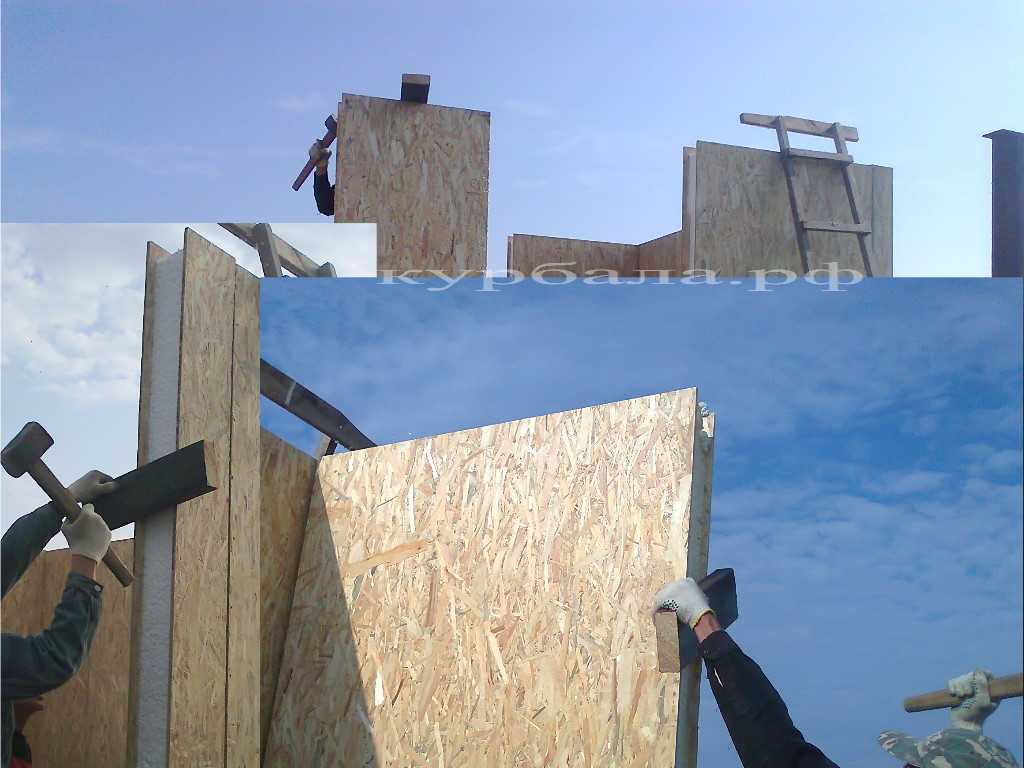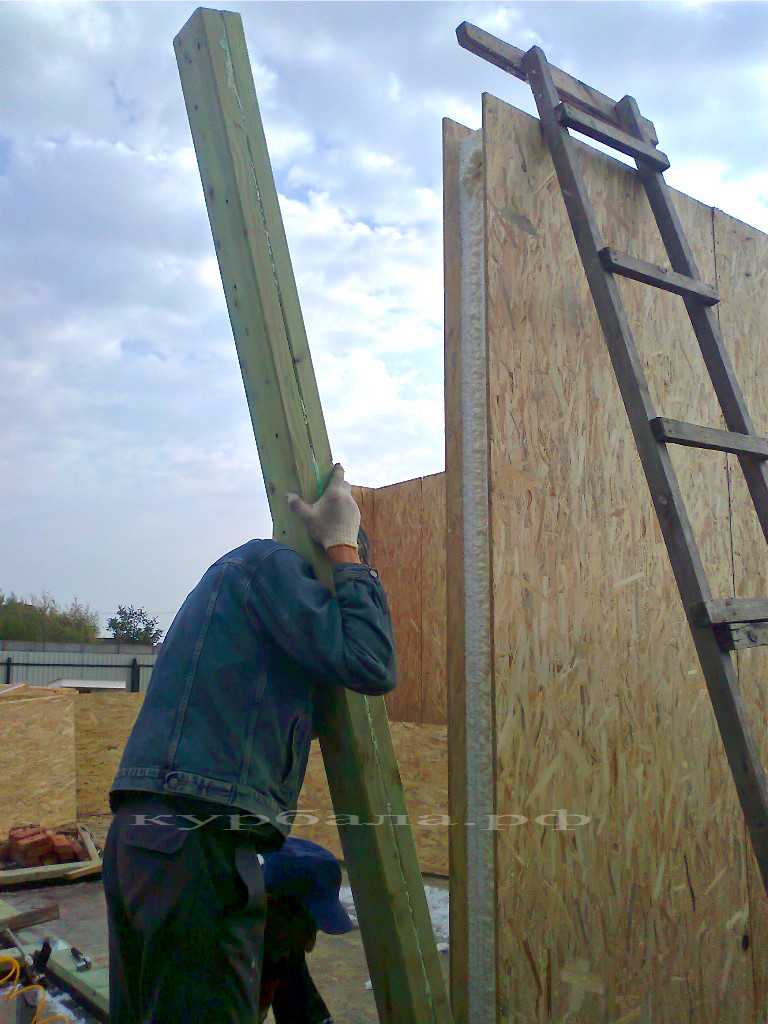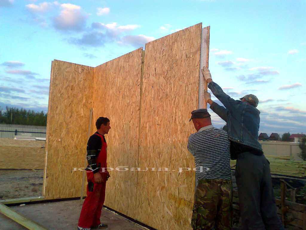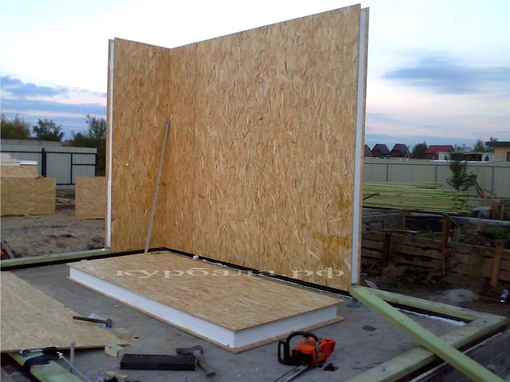 Монтаж сэндвич панелей всегда начинают с одного из углов дома, который выбирается из расчета удобства выполнения дальнейших работ. Сборка угла из двух СИП панелей может выполняться на месте или рядом с местом установки на отдельной площадке. Оптимальное количество строителей в бригаде - 3 человека, как и при