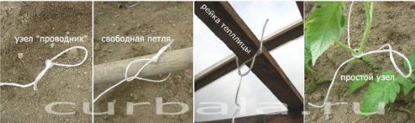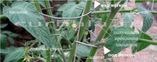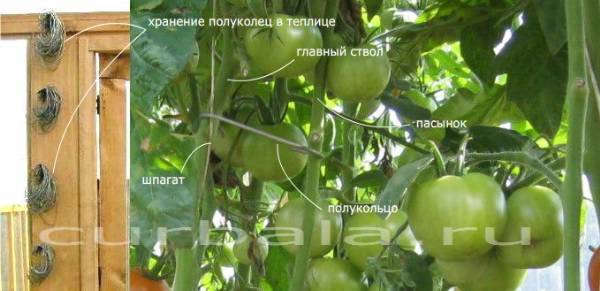 Схема подвязки пасынков куста томатов и хранения креплений.