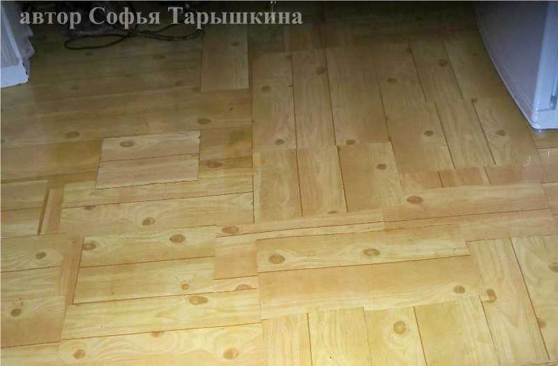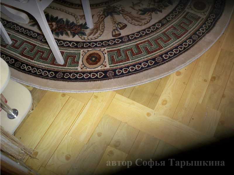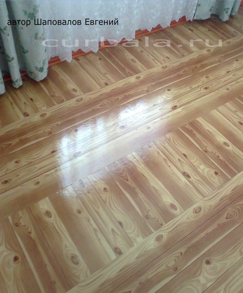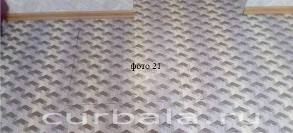 На фото 13 и 14 показаны примеры создания покрытия пола из обоев с текстурой дерева, который сделала одна из посетительниц сайта. Это пример того, что при одном и том же рисунке обоев можно сделать неограниченное количество вариантов орнамента покрытия пола.