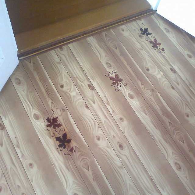 К сожалению в магазине нашего поселка имеется только один вид обоев с текстурой дерева. Если присмотреться, то можно заметить, что ширина нарисованных досок разная и нарезать их для выкладывания орнамента под паркет довольно сложно. Поэтому я решил этот вопрос более протым способом. Теще и всем, кто видел конечный результат отделки, вид пола очень понравился.