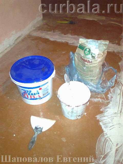 - не пугайтесь количества приготовленного клея, изображенного на фото 2. На ту площадь пола, которую оклеивал Евгений нужно было приготовить всего 2-2,5 килограмма клея, который обязательно нужно разбавить таким же количеством воды и не менее. Если обои не однослойные, то воды нужно добавить полтора-два литра на один килограмм клея;