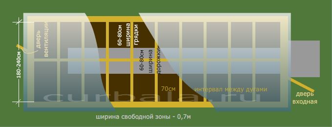 Для исключения появления застойной влаги на теневой стороне теплицы и обеспечения доступа для скашивания травы необходимо оставлять свободное пространство у теплицы не менее 0,7 метра.