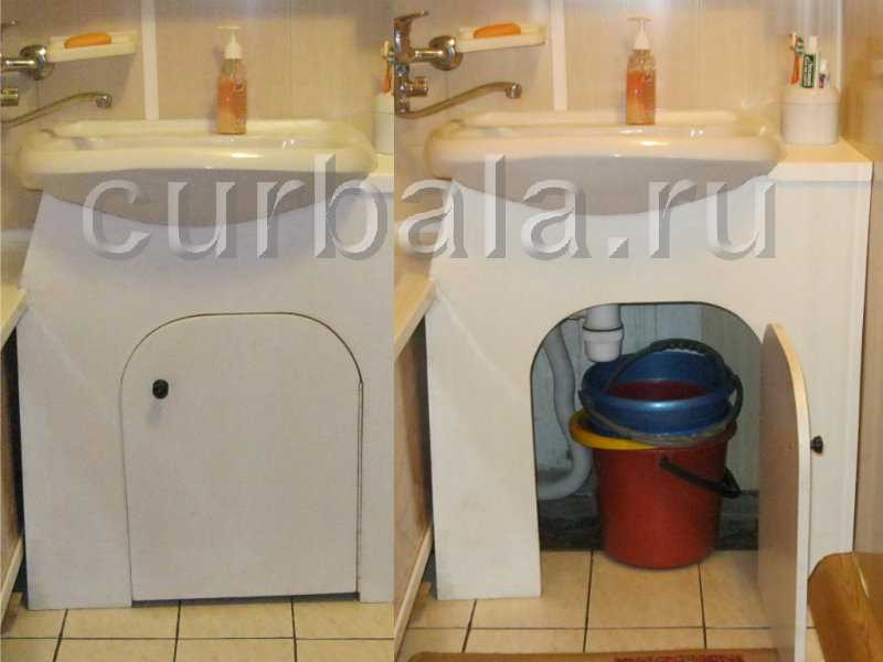 В предлагаемом варианте закрытия угла крышка и дверка не связаны между собой и, при необходимости, каждая деталь легко снимается отдельно. Обе детали сделаны из ДСП, хотя крышку умывальника можно изготовить из пластиковой подоконной доски и в нее врезать мойку любой конфигурации (фото 1).