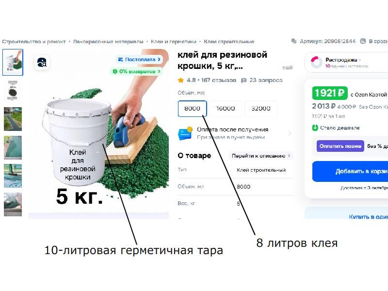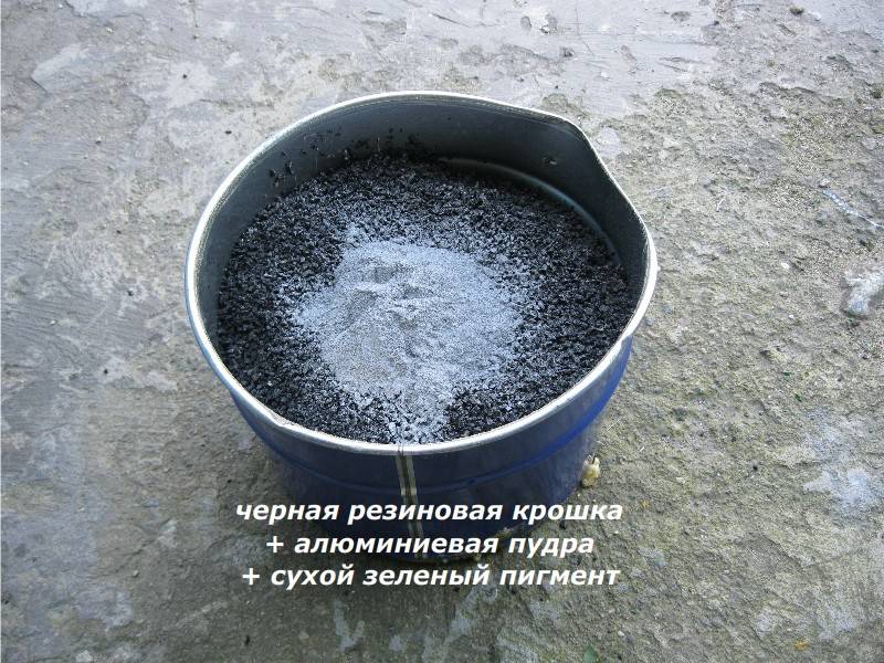Перед смешиванием резиновой крошки с клеем нужно крошку взвесить. Примерно из расчета 5 килограмм крошки на 1 литр полиуретанового клея. Объем замеса нужно делать из расчета выполнения укладки крошки в течение 30 минут.