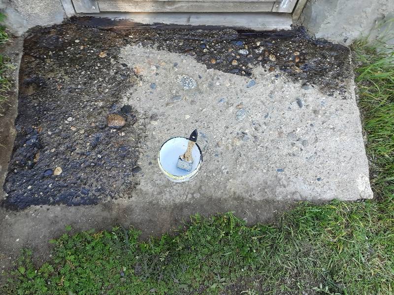 Затем в пластиковом ведерке нужно приготовить грунтовку - смешать полиуретановый клей со скипидаром (с добавлением ацетона, если клей слабо или вообще не разжижается). Полученной грунтовкой нужно с помощью флейцевой кисти смазать подготовленную основу. Такой основой может быть бетон, асфальт, доска (любого состояния и слоев окраски), уплотненный щебень или отсев.