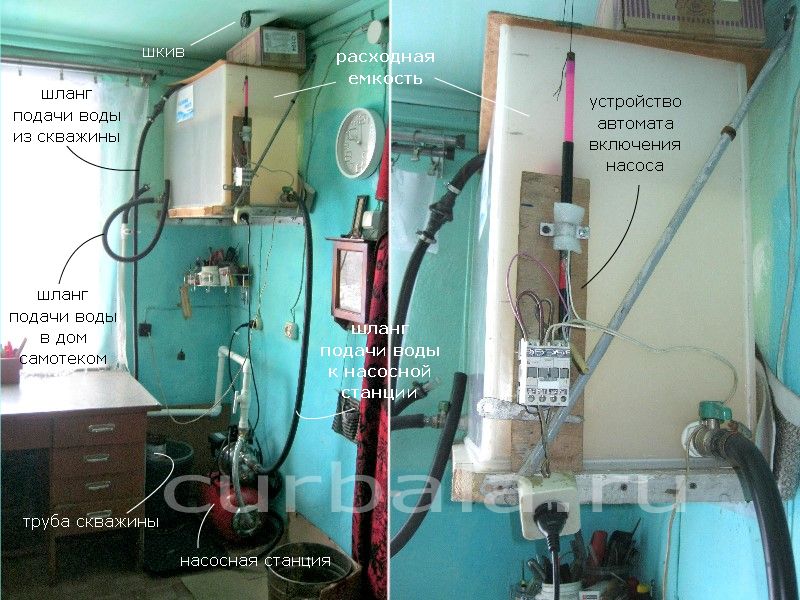 - в расходную емкость, в которую набирается вода из скважины с помощью глубинного насоса, устанавливается обычный сантехнический или пенопластовый поплавок, в который ввинчивается (или крепится любым удобным для Вас способом) неметаллический стержень;