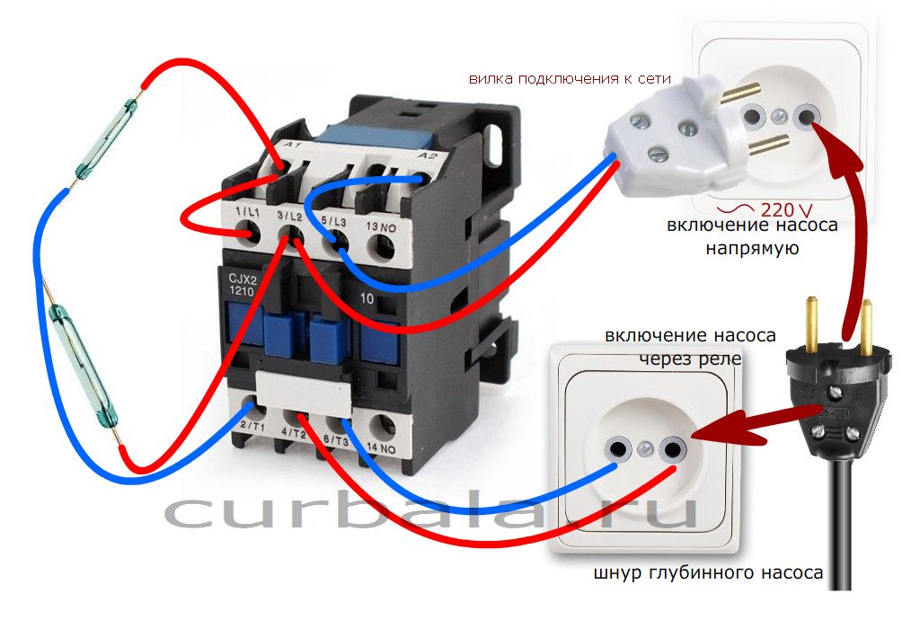- схема подключения выключателя к насосу следующая: в кабеле питания насоса делаем разрыв одного из проводов и подключаем к контактам выключателя, сам же кабель с помощью вилки подключаем к розетке.