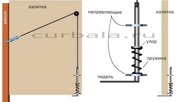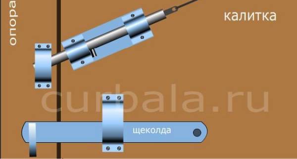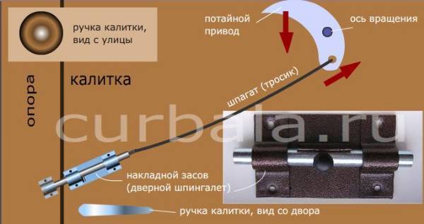 - изображенная форма привода открывания засова предусматривает легкое нажатие кончиками пальцев сверху. Расположение привода в удобном для хозяина месте, но необычном для посторонних, может сделать запор калитки с некоторой долей секретности. Прочность такого запора калитки зависит от размеров накладного засова и толщины стержня;